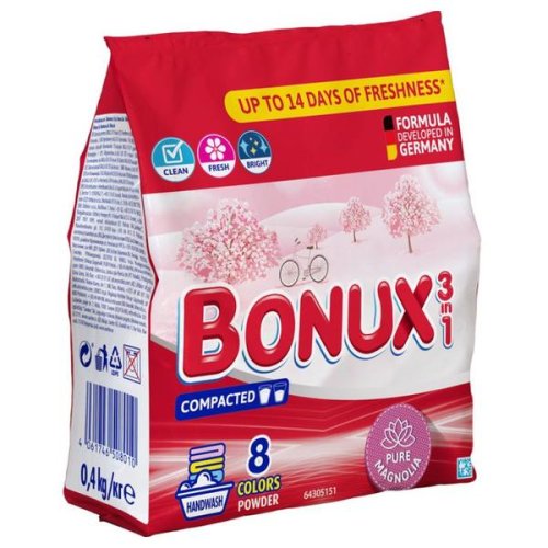 BONUX MOSÓPOR 400G MANUAL MAGNOLIA COLOR (zacskós) (26/krtn) Cikkszám: Vonalkód: 4061746508010 Rendelési egység: db Kiszerelés: Bezárás